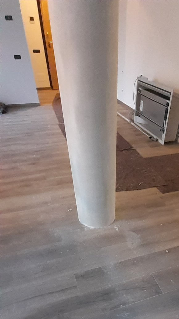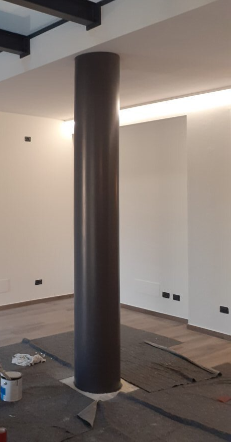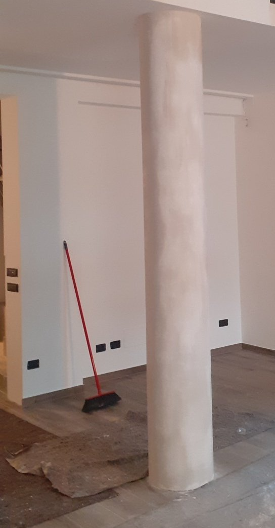 Intervento di fornitura e posa di un rivestimento in cartongesso rinforzato per la formazione di una colonna a sezione circolare su un pilastro esistente a sezione quadrata
