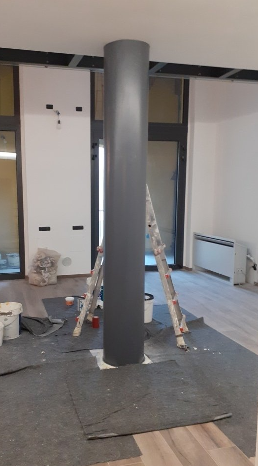 Intervento di fornitura e posa di un rivestimento in cartongesso rinforzato per la formazione di una colonna a sezione circolare su un pilastro esistente a sezione quadrata