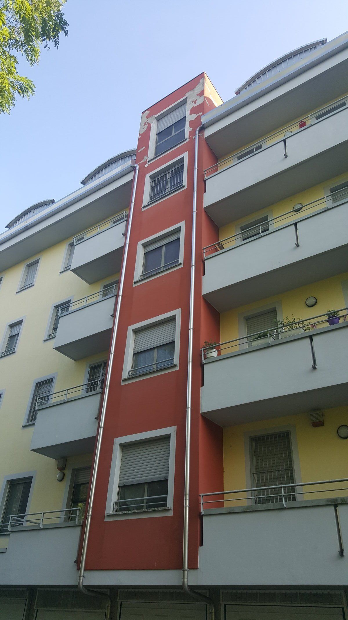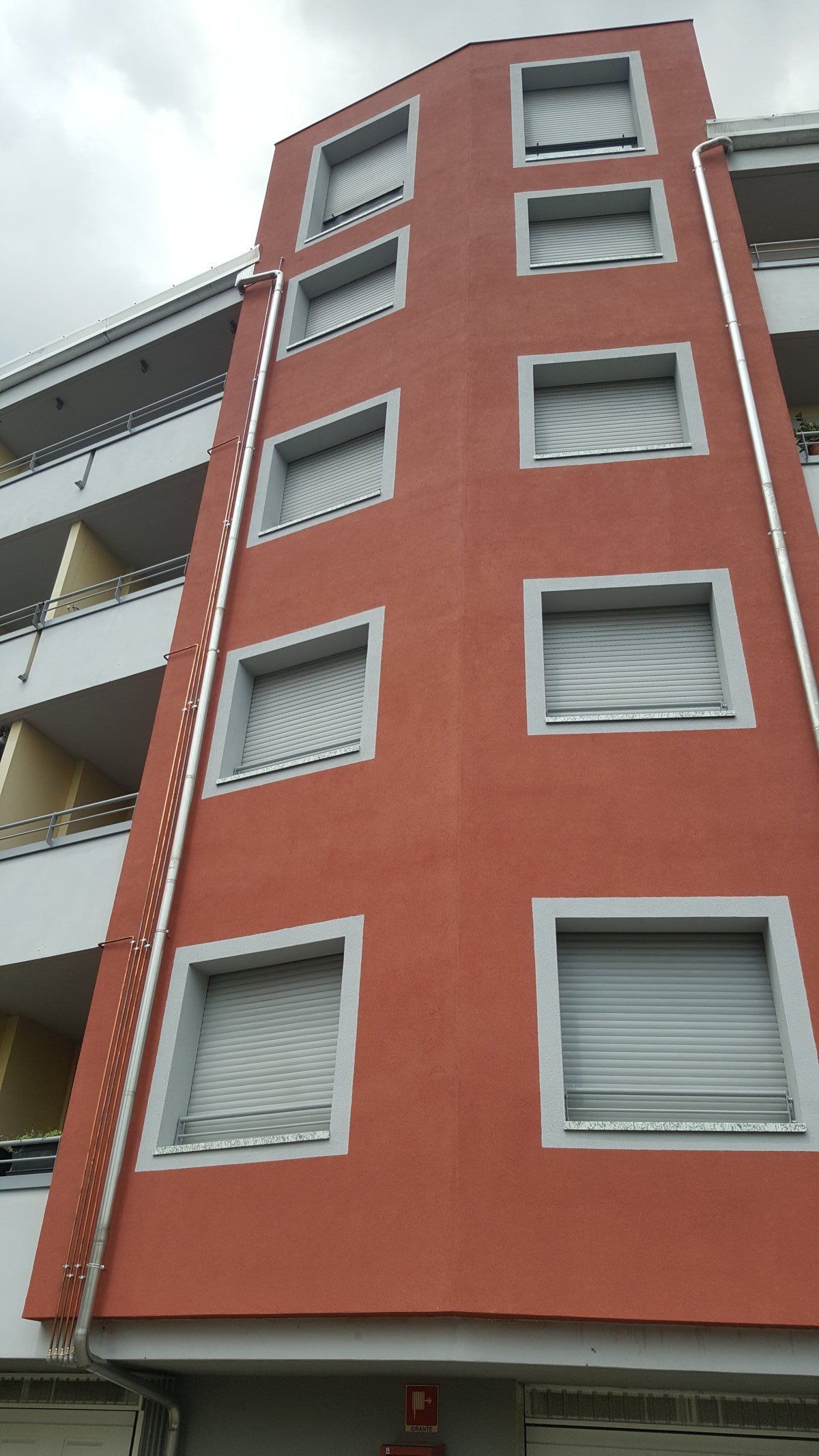 Intervento di riqualificazione parziale di facciata, in particolare delle porzioni di colore rosso, con posa di cappotto isolante, oltre ad un intervento di sistemazione dell'involucro delle cappuccine poste in copertura.