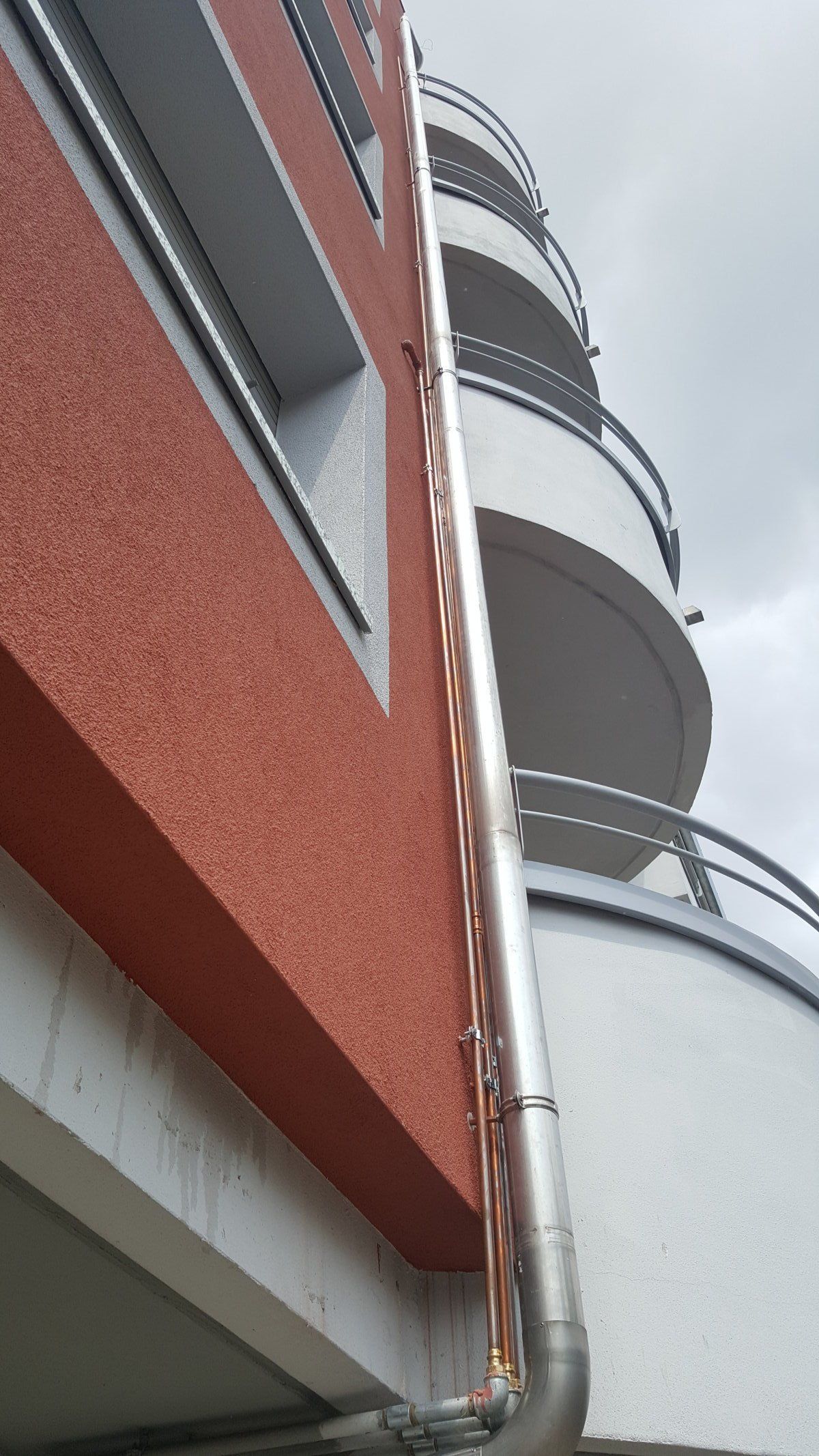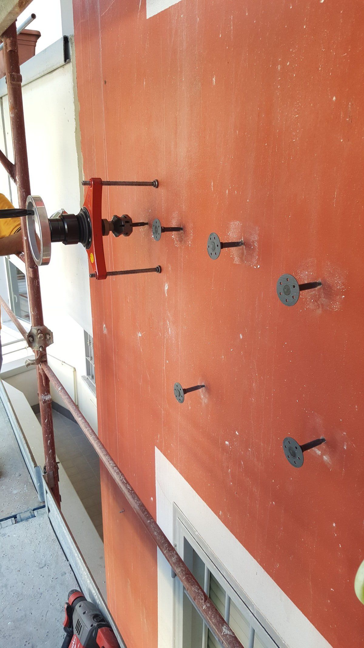 Teilsanierung der Fassade, insbesondere der rot gefärbten Bereiche, mit Einbau eines Isoliermantels sowie eines Eingriffs zur Sanierung der Bedeckung der Cappuccinos auf dem Dach.
