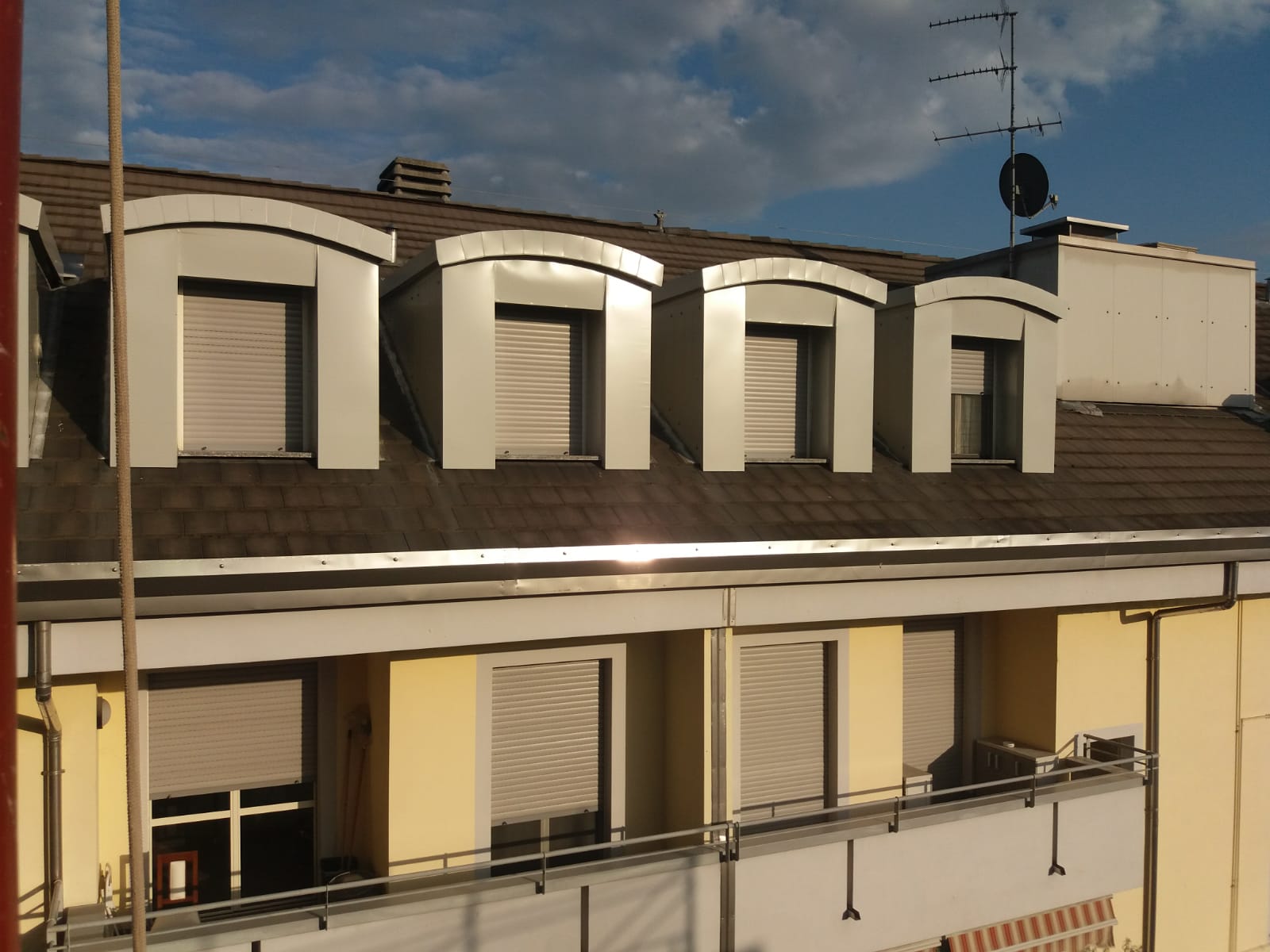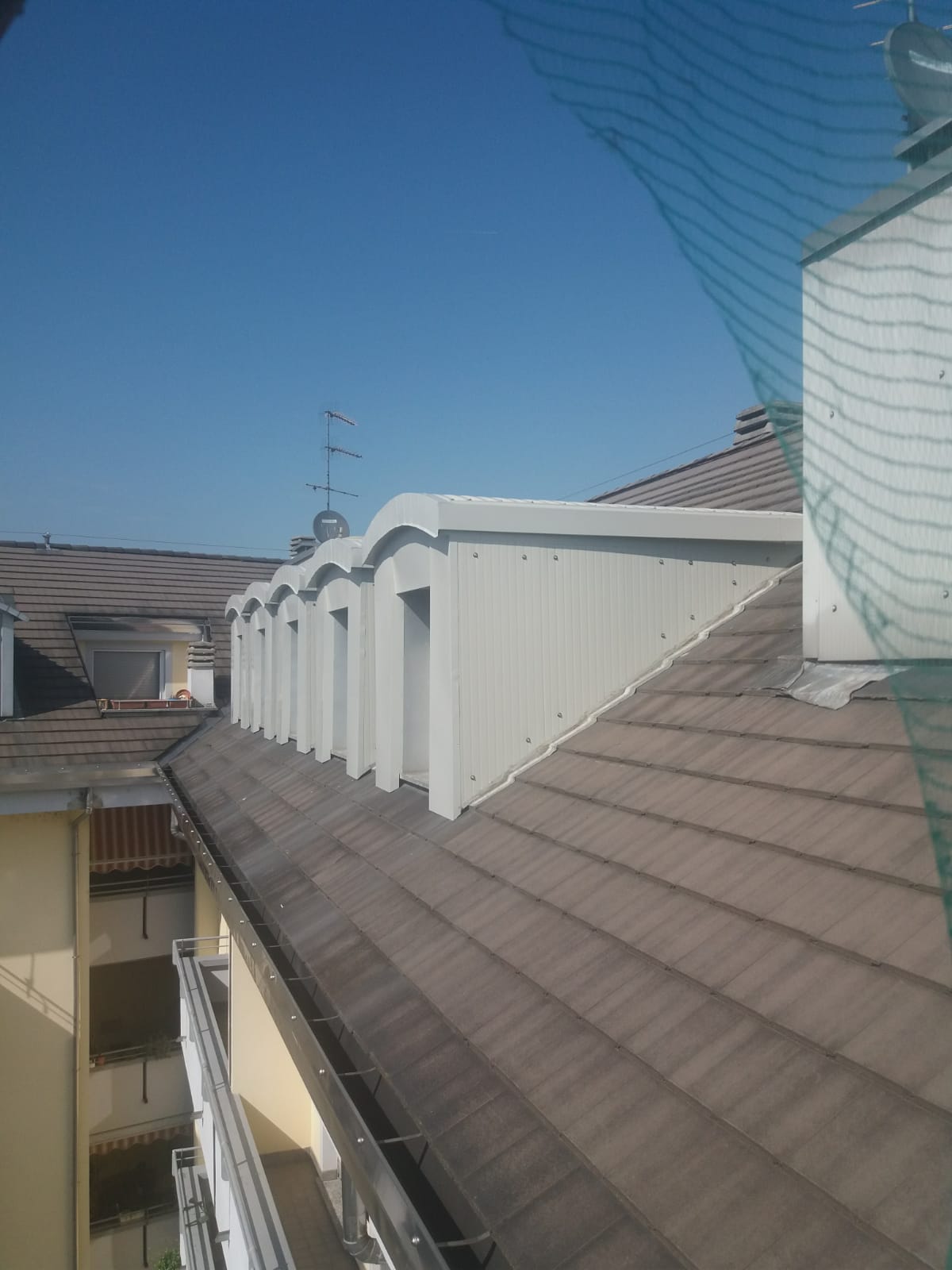 Réaménagement partiel de la façade, en particulier des parties de couleur rouge, avec la pose d'un revêtement isolant, ainsi que d'une intervention de rénovation du revêtement des cappuccinos sur le toit.